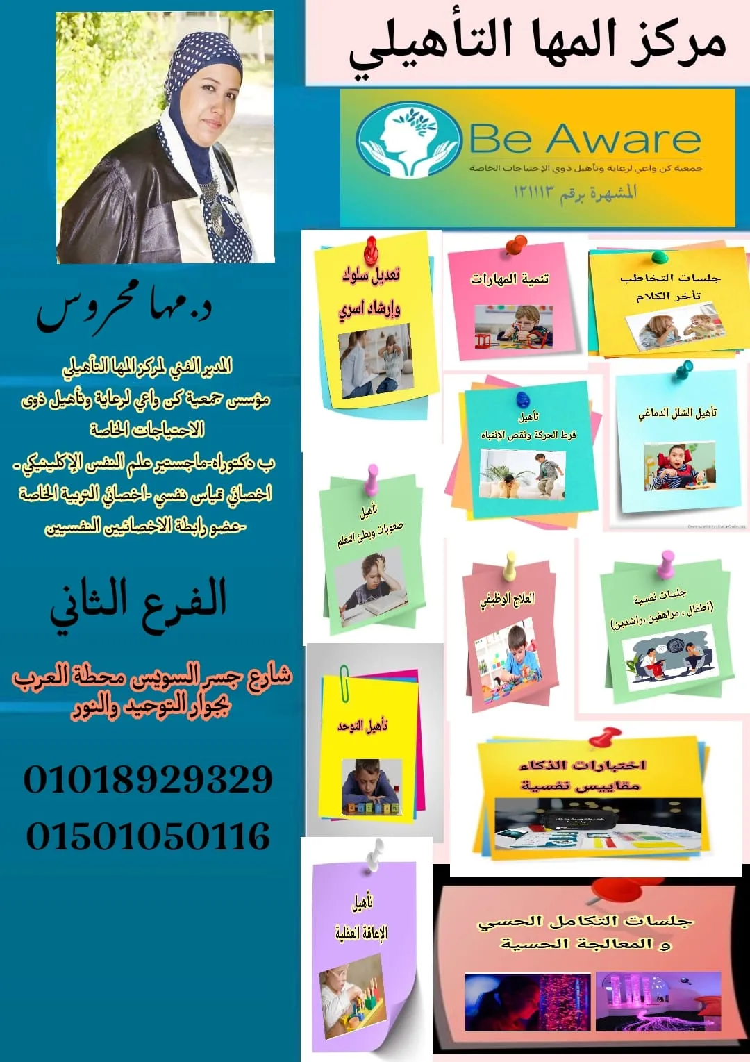 مركز المها التأهيلي هو مركز متخصص في تقديم جلسات التخاطب، تنمية المهارات، تعديل السلوك، علاج صعوبات التعلم، تقديم استشارات نفسية، والقياس النفسي، بإشراف مباشر من د. مها محروس سيد.